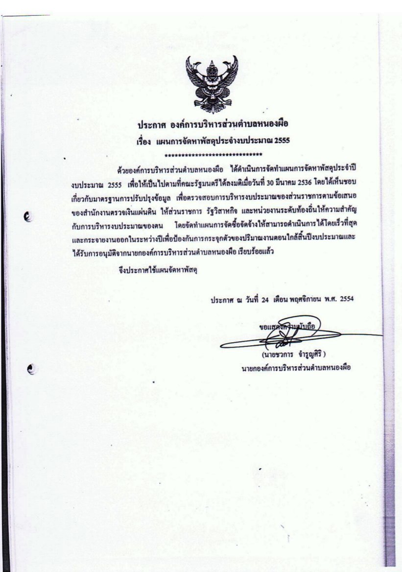 ประกาศองค์การบริหารส่วนตำบลหนองผือ เรื่อง แผนการจัดหาพัสดุประจำงบประมาณ 2555