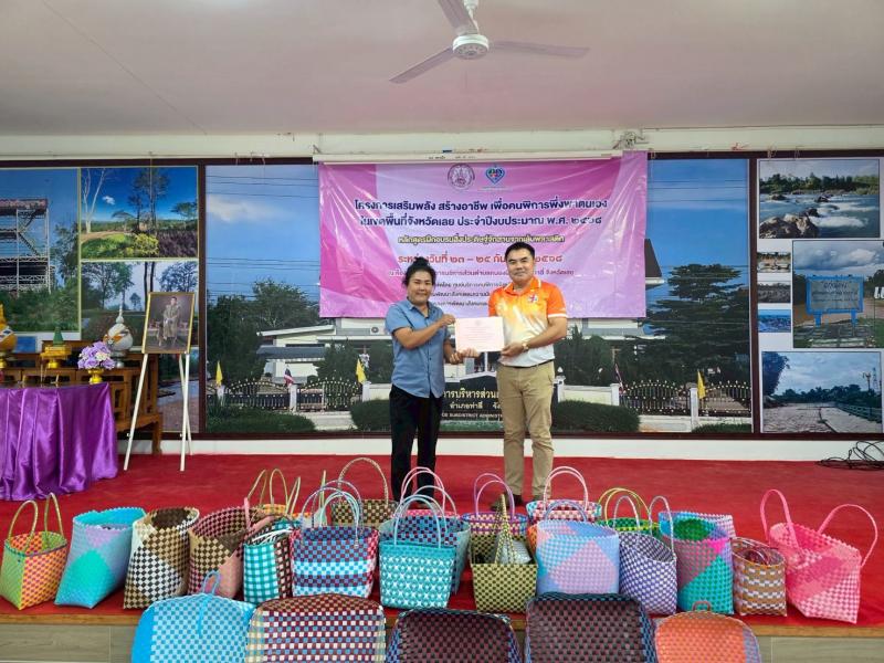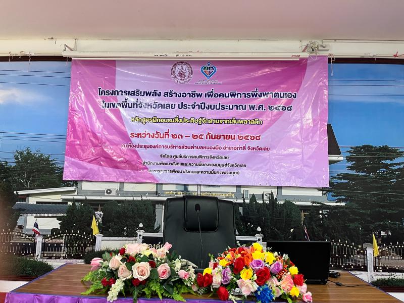 รายละเอียด : วันที่ 23 กันยายน 2568 นายธีรยุทธ พิลาคุณ นายกองค์การบริหารส่วนตำบลหนองผือ ได้ร่วมเป็นประธานเปิดโครงการเสริมพลัง สร้างอาชีพ เพื่อคนพิการพึ่งพาตนเองในเขตพื้นที่จังหวัดเลย ประจำปีงบประมาณ พ.ศ. 2568 หลักสูตรฝึกอบรมสิ่งประดิษฐ์จักสานจากเส้นพลาสติก ระหว่างวันที่ 23-25 กันยายน 2568 จัดโดยศูนย์บริการคนพิการจังหวัดเลย มีผู้เข้าร่วมประกอบด้วย ผู้พิการและผู้ดูแลคนพิการในพื้นที่ตำบลหนองผือ จำนวน 20 คน วัตถุประสงค์เพื่อการสร้างอาชีและรายได้ให้แก่ผู้พิการและผู้ดูแลคนพิการและใช้เวลาว่างให้เกิดประโยชน์